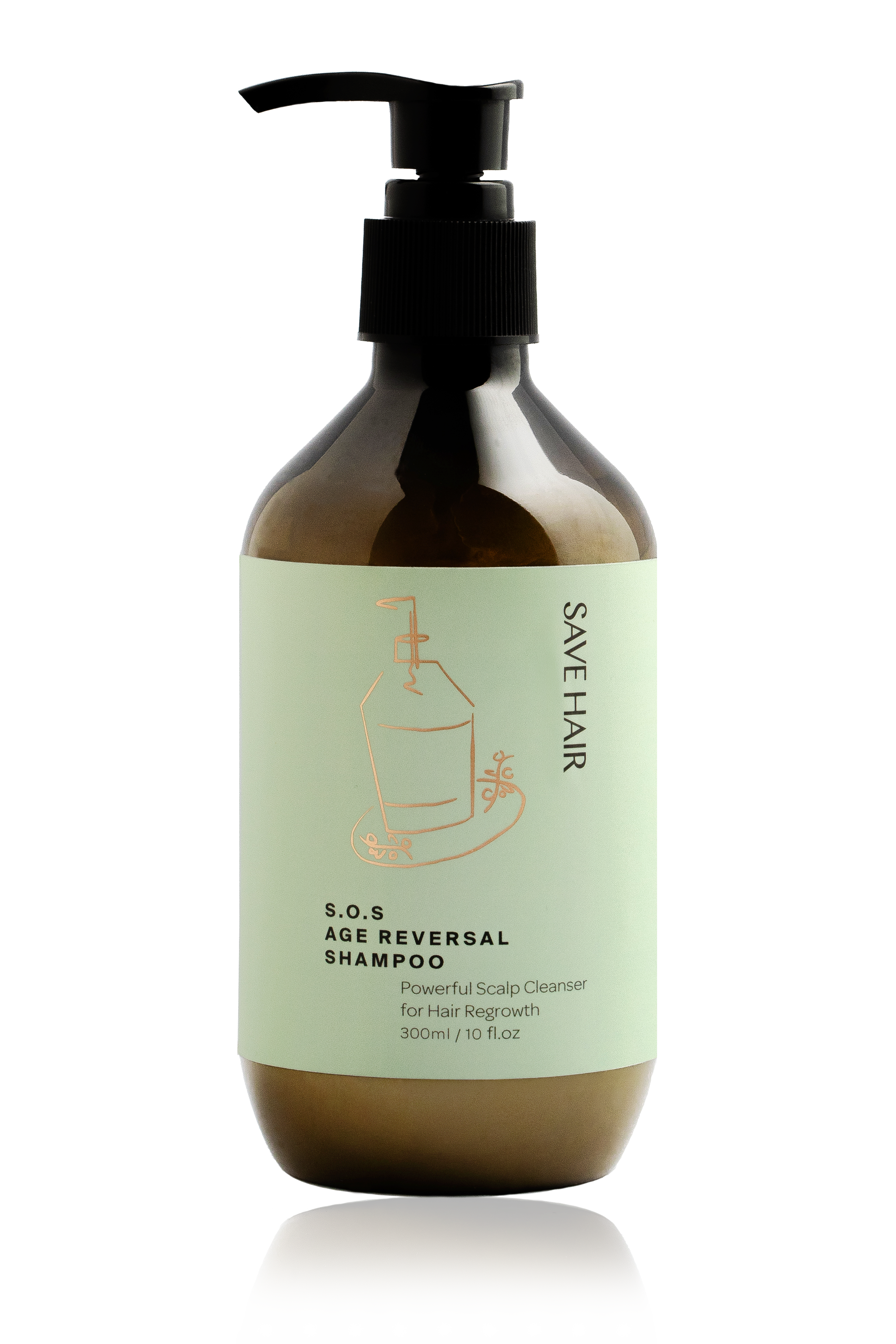S.O.S Age Reversal Shampoo is a powerful scalp cleanser, designed to protect scalp biochemistry and reinforce hair shaft with key nutrients to reduce breakage and hair loss. Our signature shampoo reverses hair loss by cleansing hair follicles of sebum buildup and stimulating pigment production with active botanical ingredients.