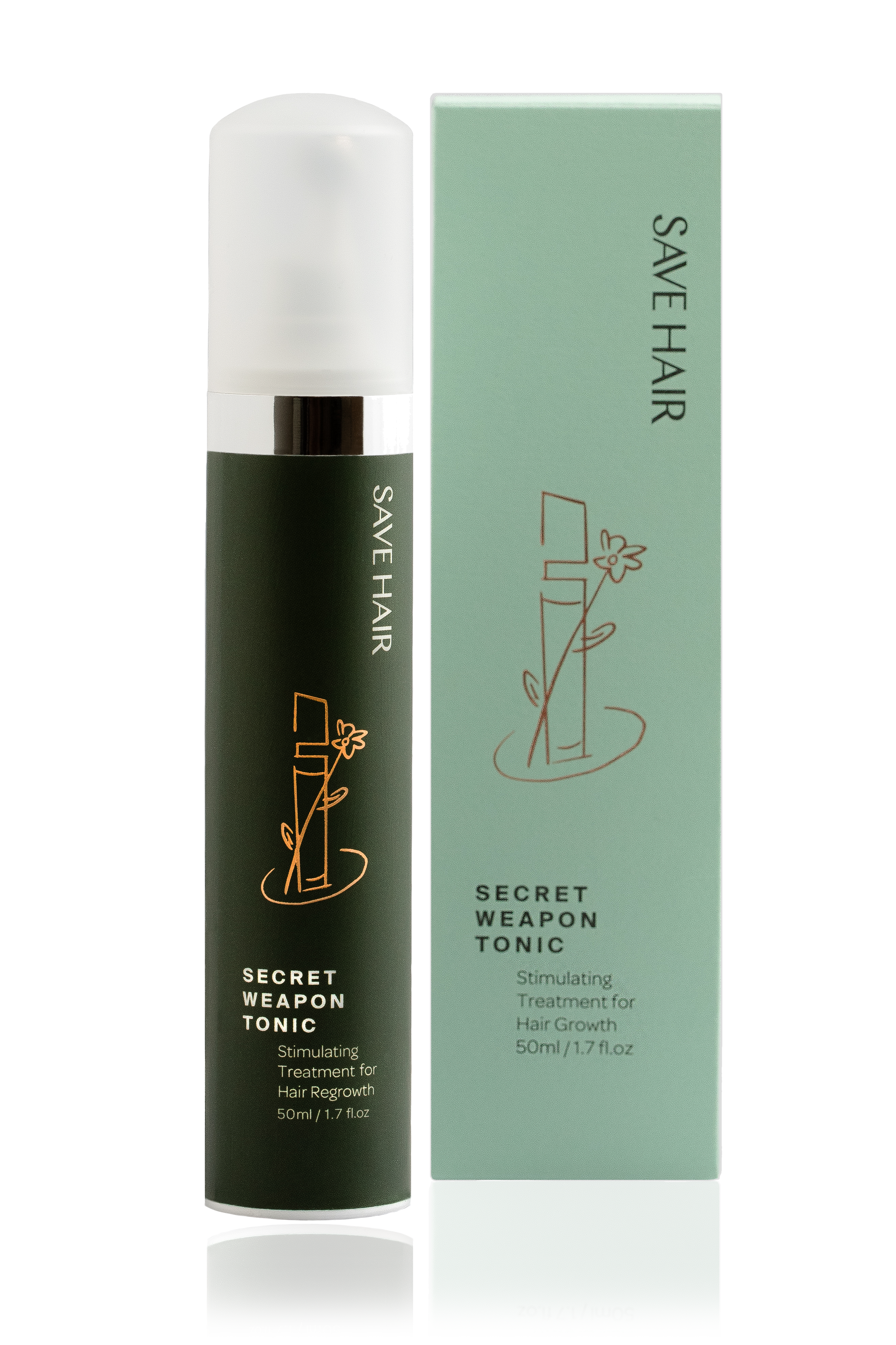 Secret Weapon Tonic effectively reduces hair loss and preserves the scalp's optimal biochemistry. Our tonic is a patented high ppm botanical cocktail of active ingredients such as centella and chamomile, working at the roots to fortify and improve conditions for hair growth. For optimal efficacy, use after wash as a leave-in scalp treatment.